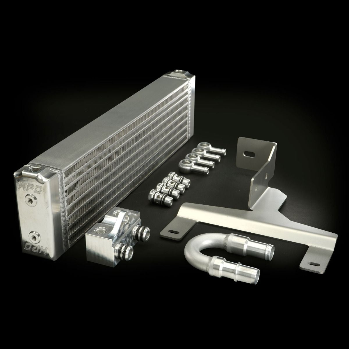 All HPD transmission cooler kits come with everything required to install on to your vehicle. Kit consist of transmission cooler, stainless steel laser cut bracketry, billet CNC adaptor plate, hose tail fittings, support clamps, insulation, oil hose, nuts, bolts, washers and installation instructions.