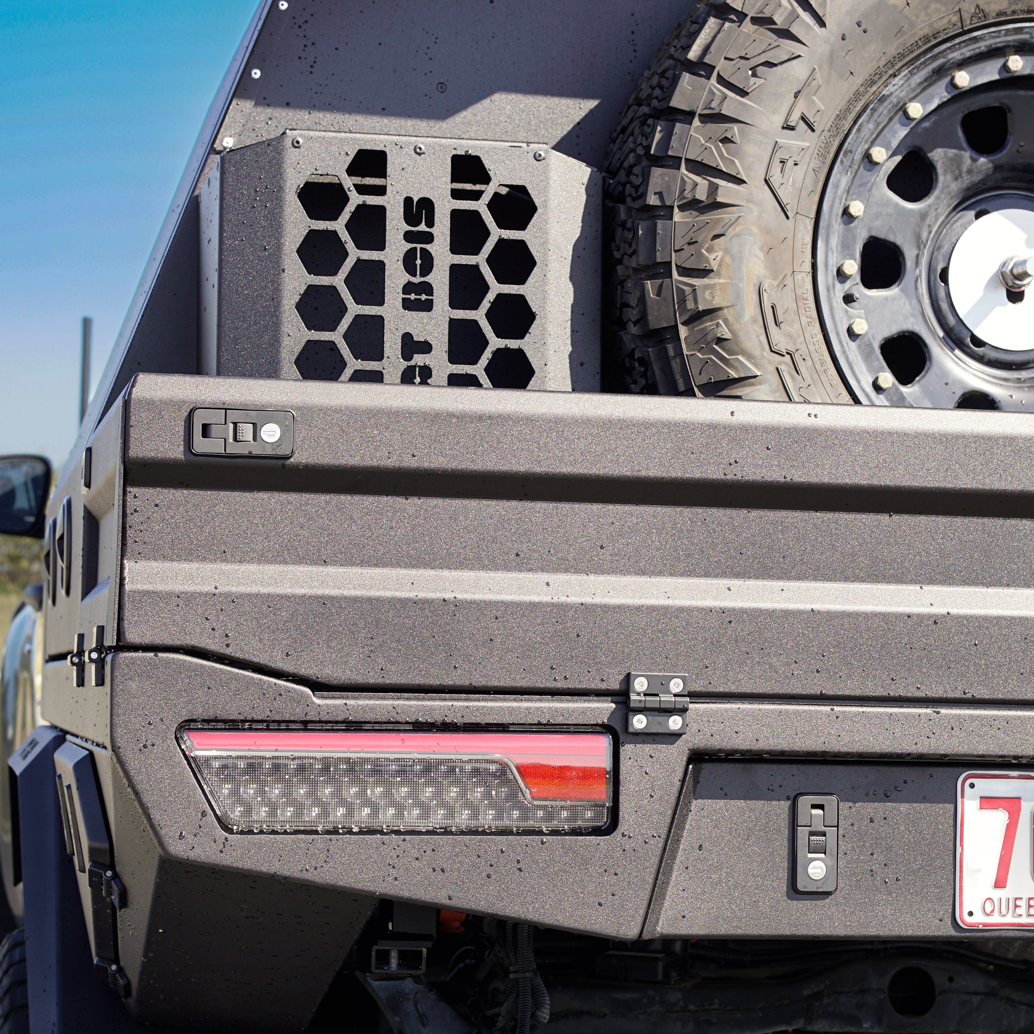 - Rear canopy-mounted spare holder